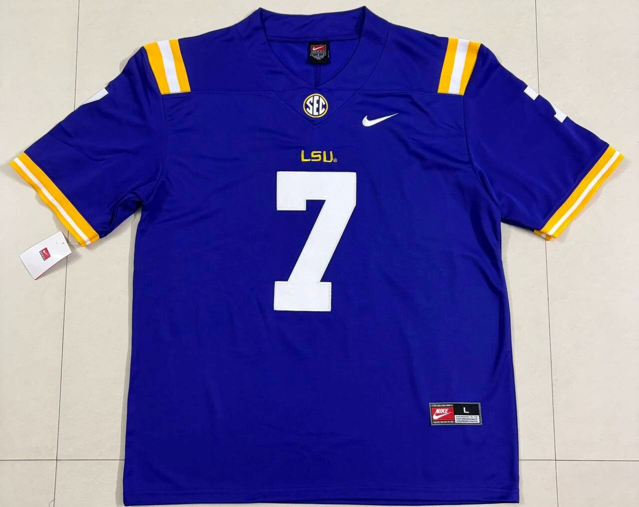 Display your LSU Tigers pride with this authentic #7 Nike stitched jersey. Crafted with official embroidered numbering and premium stitching throughout, this collectible represents the storied tradition of Tiger football. The durable construction and quality materials ensure this jersey withstands years of wear and display. Perfect for devoted fans and collectors seeking authentic gameday apparel. Available in Carry L and XL sizes.